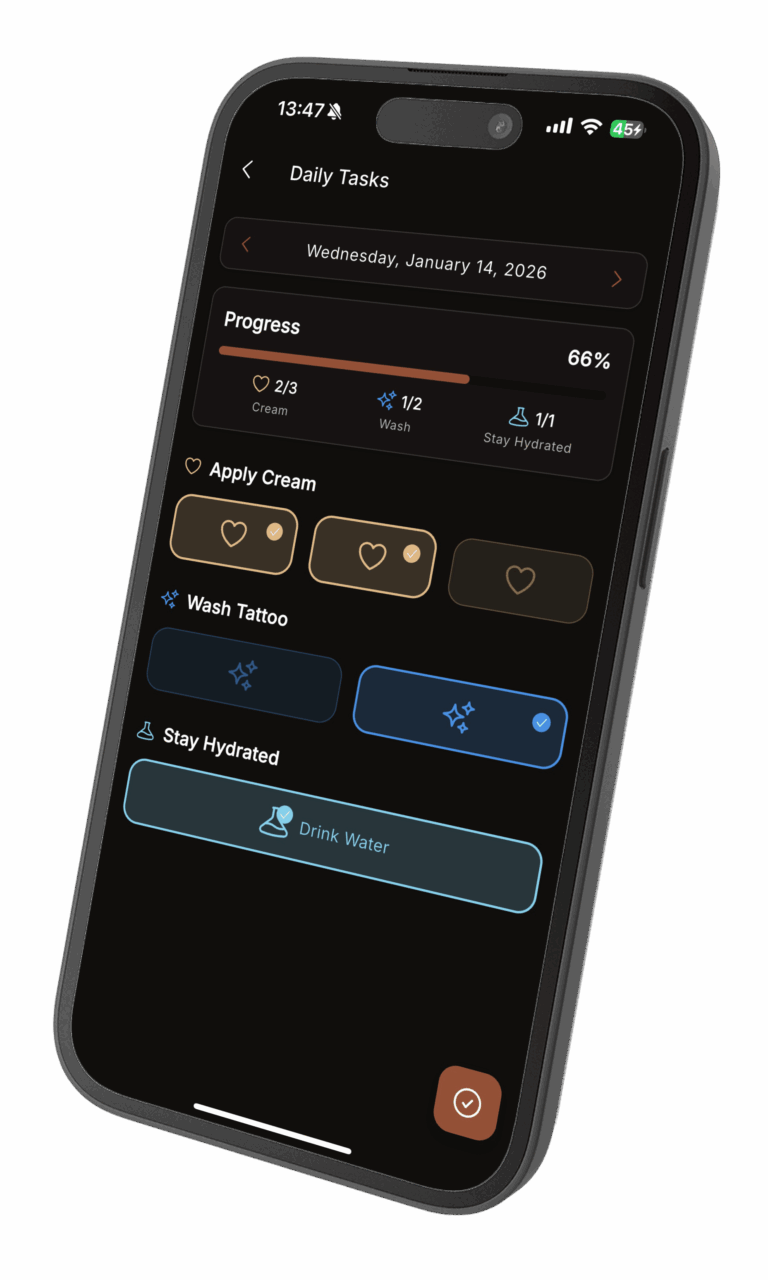 After you get tattooed, you follow a routine inside the app that matches the instructions you were given by your artist (or a routine you select). TattooHealer then supports you day-by-day with reminders, step checklists, and guidance on what’s normal during each healing stage, so you don’t have to guess or search online for conflicting advice.